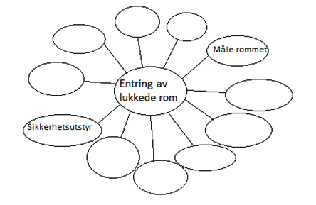 l) Fyll inn boblediagrammet det som er viktig å gjøre før entring av et lukket rom, to punkter er alt fylt inn, det er sikkerhetsutstyr og gassmåling.