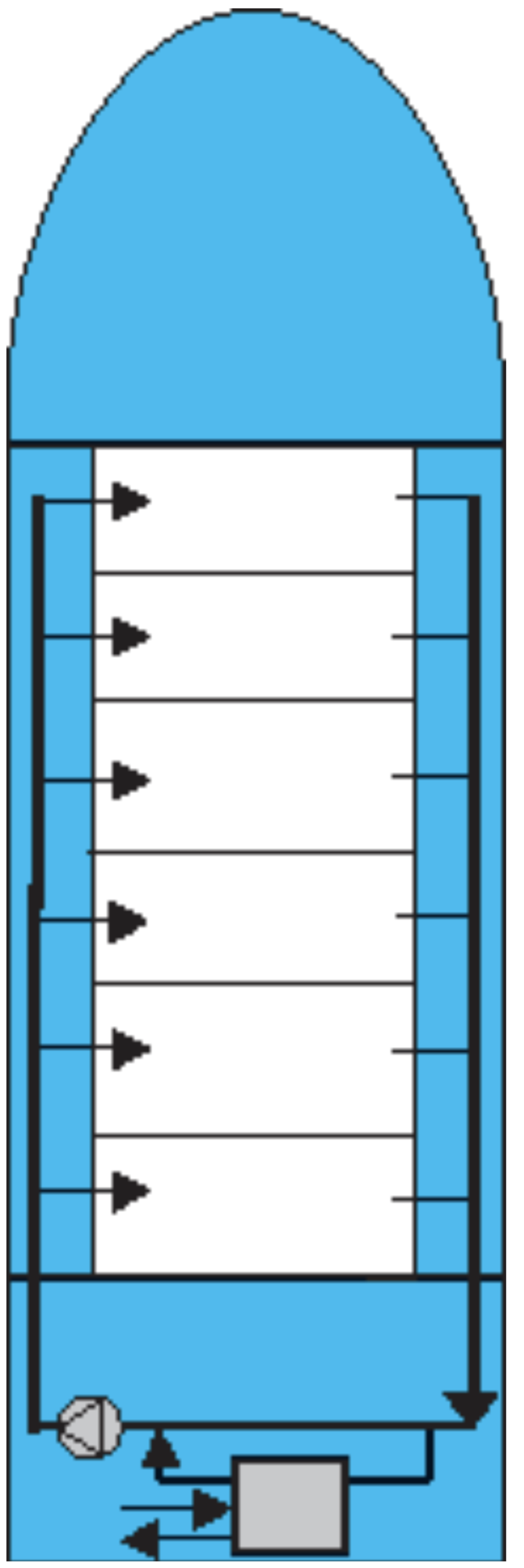 Kjølning av lasterom: Før i tiden var det vanlig at kjølemiddelet ble sendt direkte til luftkjøleren som var plassert i hvert lasterom. Bakdelen var hvis det ble lekkasjer så ble lasten skadet eller ødelagt. I dag er det indirekte kjøling som gjelder, der det går utpå at man sirkulerer to arbeidsmedier. Kjølemiddelet blir sirkulert på utsiden av lasterommene mens saltlaken (Engelsk Brine) blir sirkulert inne i lasterommene. Luftkjølerne er montert slik at luften blåses ned i avdelingen (compartment) og beveger seg langs dekk i lengderetning hvor det dobbel bunn for så å bevege seg vertikalt oppover. I hver avdeling / lasterom er det rister (Engelsk grating) som er nøyaktig utformet slik at de gir en god luftstrømminger opp i rommet, luften vil strømme over alt i rommet. Luften som kommer ut av rommet blir benyttet som retur luft til kjølerne.