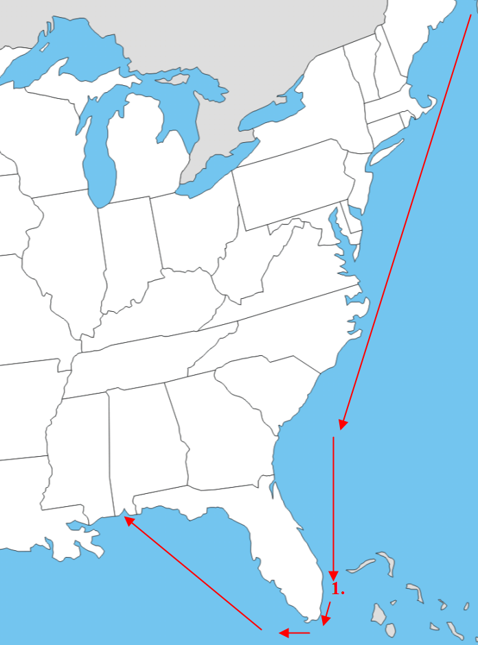 Figur 07.04 viser et kart utsnitt på en reise fra New Foundland til Mobile Alabama