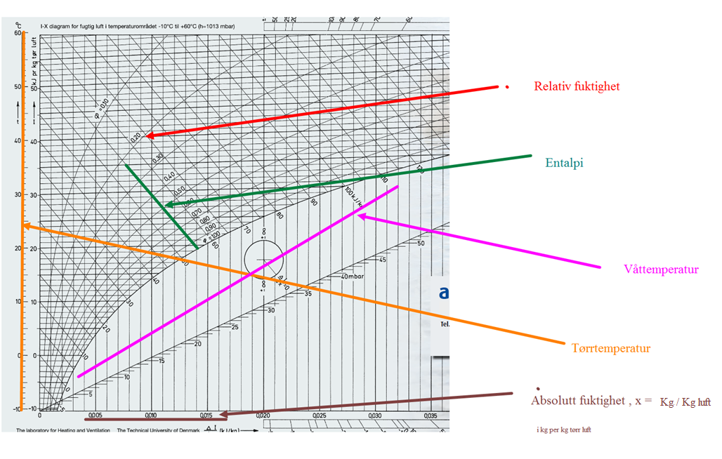 Tenk deg en blokk med is. Molekylene er i is i svært lav bevegelse. Ved 0 Kelvin er de helt i ro (det absolutte nullpunkt). I vanndamp derimot suser vannmolekylene rundt i høy fart. De har høy energi. Derfor er vanndamp ganske så varmt (ca. 100 grader). Entalpi er en tilstandsfunksjon. Det vil si at endringa i entalpi når et system går fra en tilstand til en annen er uavhengig av vegen mellom tilstandene. Våt temperatur settes ut i fra denne skråstilte akse, følger samme vinkel som entalpi. Absolutt fuktighet er angitt i kg pr kg (tørr luft).