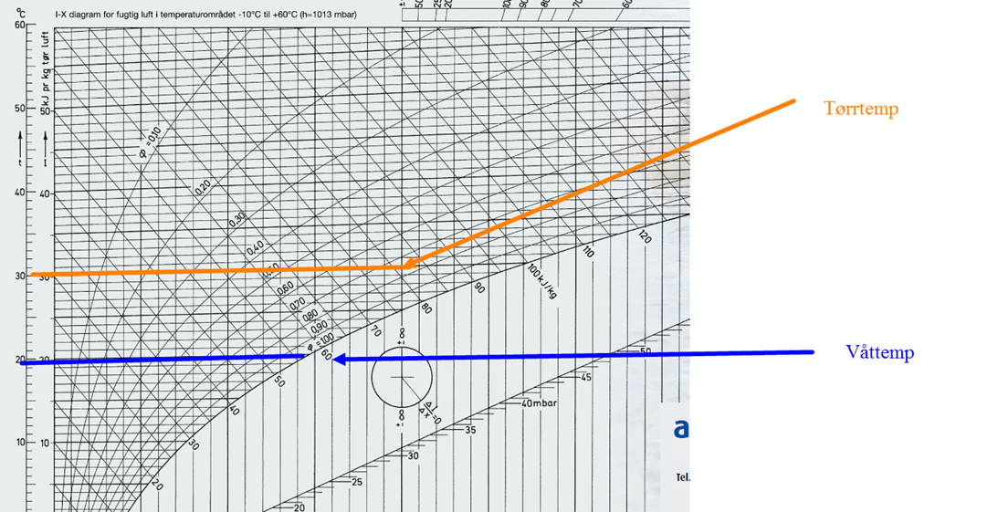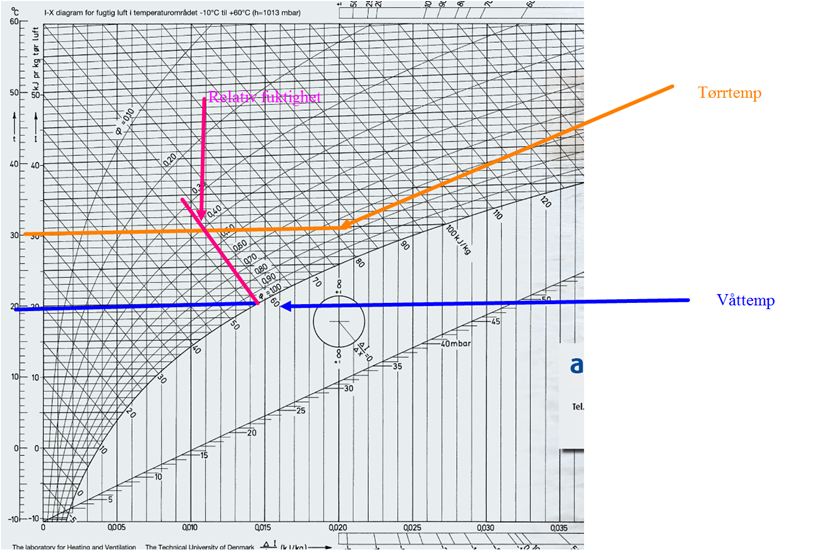 I et lasterom blir tørr temperatur (Tt) målt til 30°C og våt temperatur (Tv) til 20° C ved hjelp av et psykrometer.