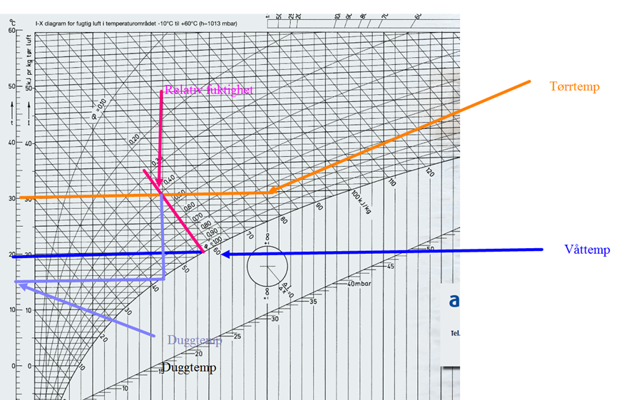 Beregne fuktighet og duggpunkt temperatur ved hjelp av hx diagram: