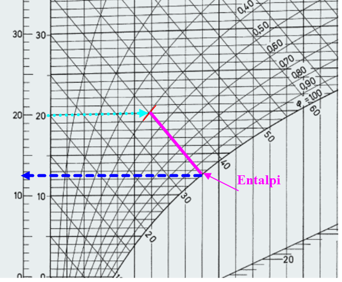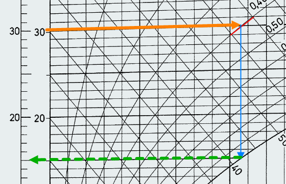 Vi setter av temperaturlinjen til 20°C i horisontal retning til den treffer 40 % relativfuktighet hyperbel. Fra dette punktet blir luften mettet av en vannspreder og entalpi tilstand inntreffes, følges ned til metningspunktet. Fra 100 % relativfuktighet går man til venstre i horisontal retning og man leser av temperaturen til 12,5°C.