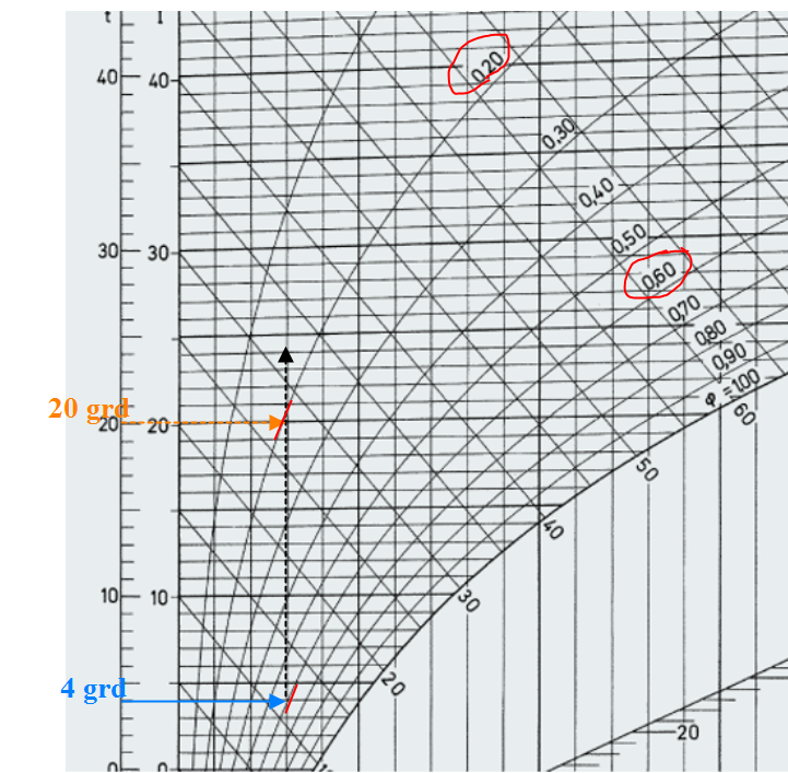 Svar: Ved økning av temperatur fra 4°C til 20°C så trekker man opp en vertikalt linje og der hvor den krysser den horisontale 20°C linjen leser man av den relative fuktighet. Her leser man den av til å bli 20 %.