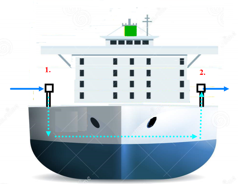 Under ser man ser man en skisse av et skip som har innsug vifte til et lasterom (1.) og utblåsing vifte (2.) tilknyttet samme lasterom. Bedøm følgende to måleresultater:
