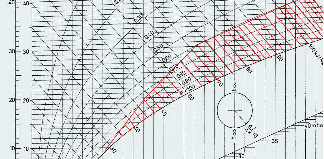 Normalt fungerer denne metoden greit når tilstanden til den fuktige luften ligger innenfor det røde skraverte området. Ved Absolutt fuktighet under 0,008.
