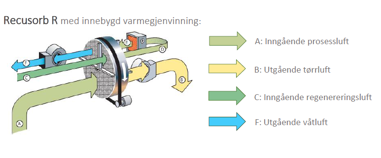 Andre systemer: Grunnprinsippet for sorpsjon-avfukter er at rotoren kontinuerlig absorberer fuktigheten fra prosessluften. Rotoren går sakte rundt og regenereres ved at oppvarmet luft tar med seg fuktigheten ut som våtluft. Den blir ikke samlet opp i reservoaret slik som det er beskrevet i eksemplet ovenfor. Recusorb R er også effektiv ved temperaturer under 0 °C. Gjengitt med tillatelse fra Alfsen og Gunderson, Norge.