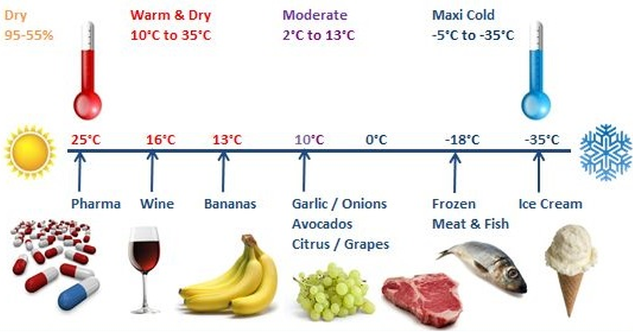 Figur 07.18 viser frakt temperaturer for en rekke produkter (ikke alle er egnet for transport på et kjøle/fryse skip.