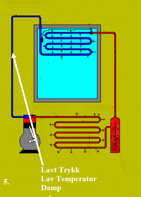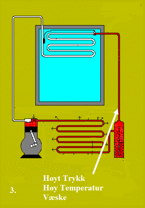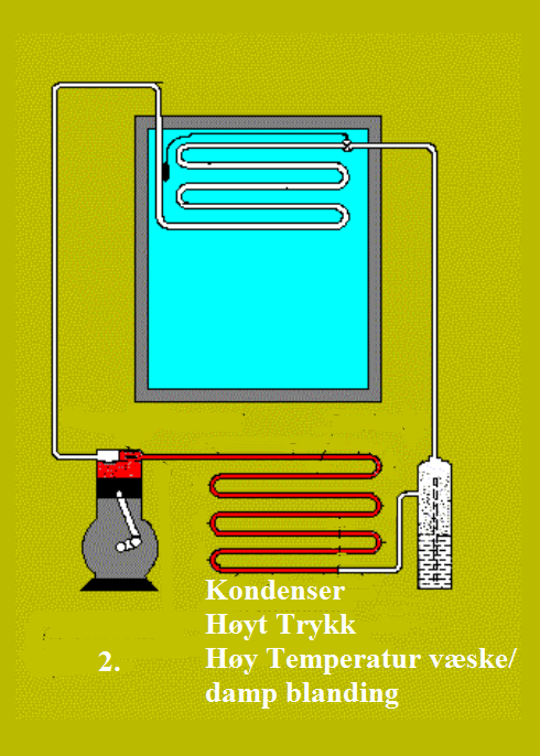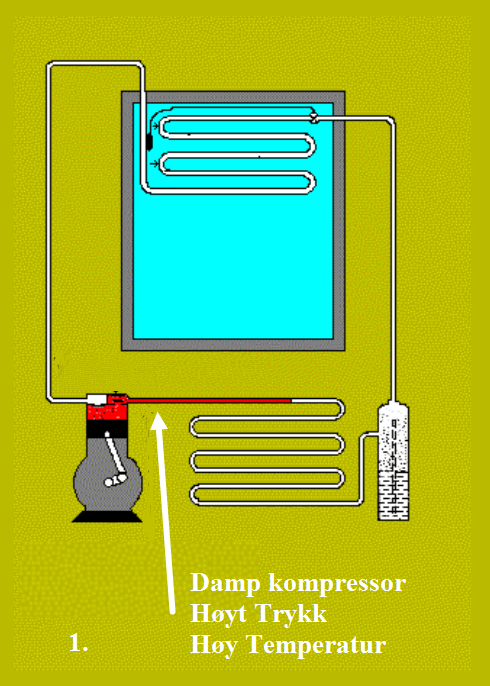 Hvordan virker et kjøleanlegg? Hvis man tar for seg et kjøleskap: et kjøleskap flytter varmen fra innsiden til utsiden. Det blir enklere å forstå hvis du har klart for deg at det ikke finnes noe slikt som kulde. Det som kalles kulde er fravær av varme. Et kjøleskap har innebygd lange rør som kjølemediet flyter i, og en kompressor som pumper det rundt i systemet. I den delen av ledningsnettet som ligger inne i skapets kalde del, hentes varme ut ved at kjølemediet fordamper ved lavt trykk. Varmen som trengs til denne fordampingen tas fra omgivelsene, som da blir kaldere. Kjølemediet varmes ikke opp, fordi all energien går med til å fordampe det. I den utvendige delen av kretsen kondenseres kjølemediet under litt høyere trykk. Kondensering avgir varme. Kompressoren sørger for at trykket i denne delen av kretsen er høyt nok til at kjølemediet kan kondensere selv ved nokså høye temperaturer, slik at det kan avgi varme til rommet rundt liggende. følge termodynamikken har vi blant annet en sammenheng P = NKT, N og k er konstanter, P er trykk og T er temperatur. Dvs. at øker trykket, øker temperaturen. Enkelt forklart har et kjøleskap en lang rørsløyfe med en væske der den ene delen er under høyt trykk og den andre under lavt trykk. Denne væsken sirkuleres og flytter med seg varme. Denne varmen avgis til luften på baksiden av kjøleskapet. Prøv å la være å tørke deg etter en dusj. Da merker man at man blir kald. Hvorfor? Fordampningen forbruker varme Et kjøleskap er rett og slett en varmepumpe. Fysikken er en god del mer komplisert enn dette men dette blir grunnprinsippet.