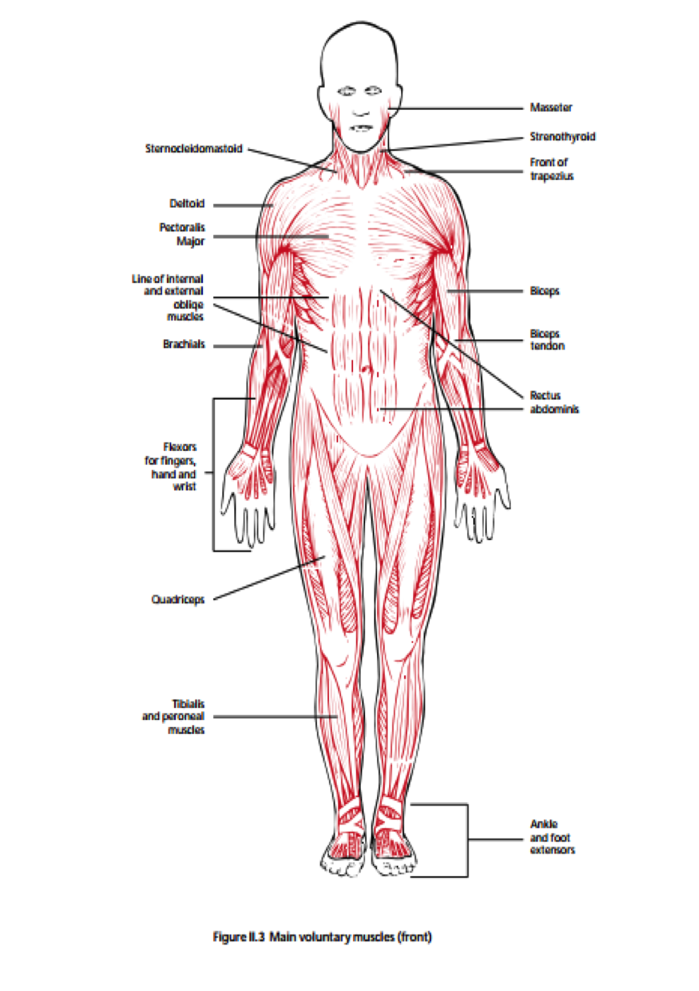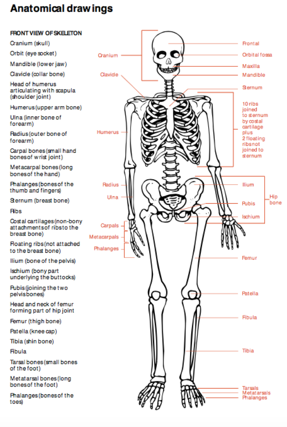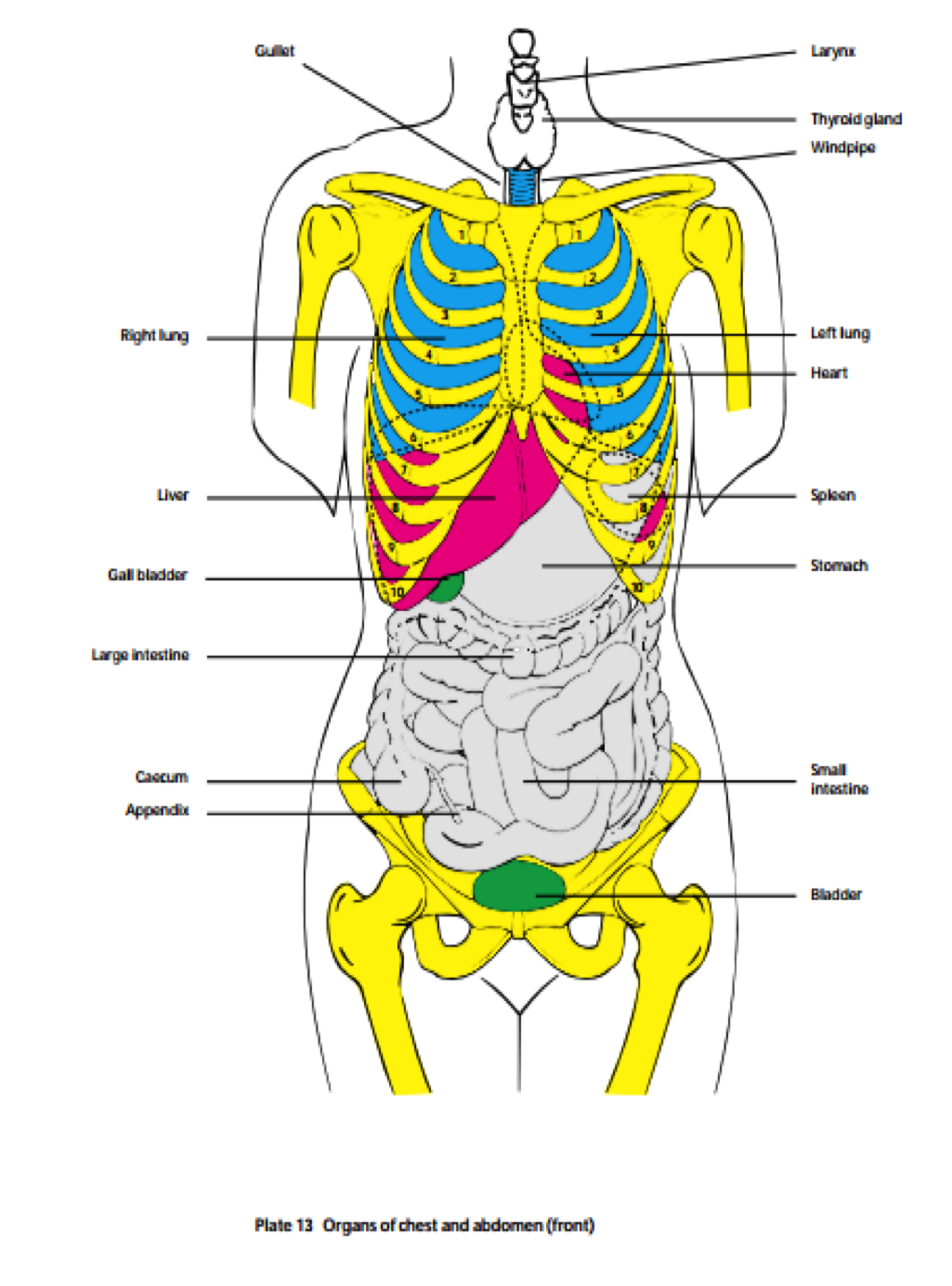 Not only when doing first aid, but also when seeking advice from Radio Medico or discussing injuries and treatments with other crewmembers, it is very important to know the proper names of the different body parts, muscles, bones and organs. Contrary to Norwegian, English has kept a lot of the Latin terminology for the skeletal, muscular and respiratory system. In the following, you will find anatomical drawings of the skeletal system, the muscular system, the respiratory system and organs of the chest and abdomen.