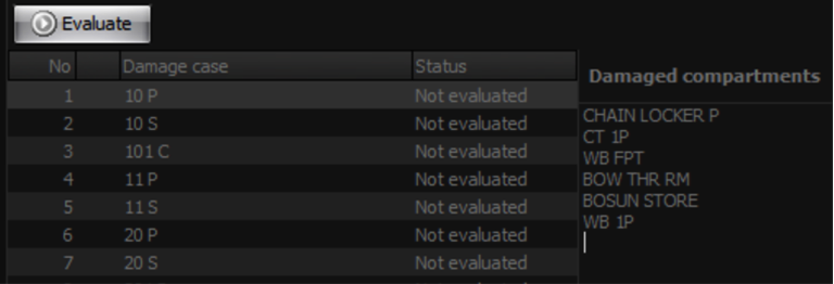 Dersom du trykker på knappen «Damage stability» vil laste computeren evaluere stabiliteten du har nå, opp mot 22 utvalgte senario med skade på skipet. I dette tilfelle, senario nummer 1 vil du få skade på følgende seksjoner, vist på bilde under.