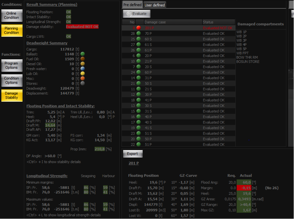 Dersom du ser bilde under, har en nå evaluert alle de 22 mest sannsynlige senarioene og fortalt hvilke av disse kondisjonene som vil holde skipet innenfor kravet og hvilke som ikke holdes innenfor kravet til damage stability.