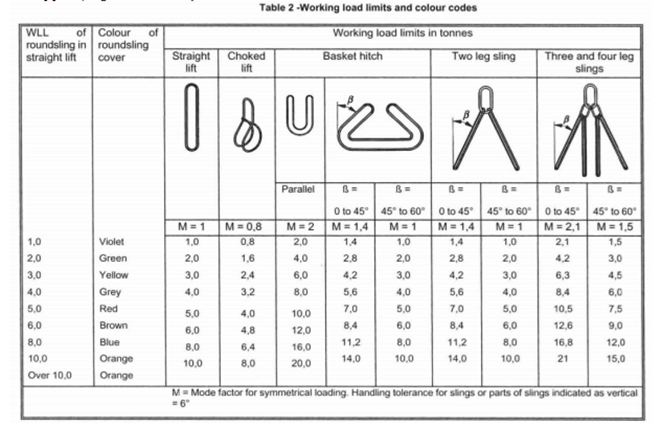 Bildet er gitt av Westcon løfteteknikk, viser en løftetabell for rundslinger med WLL og fargekoder.