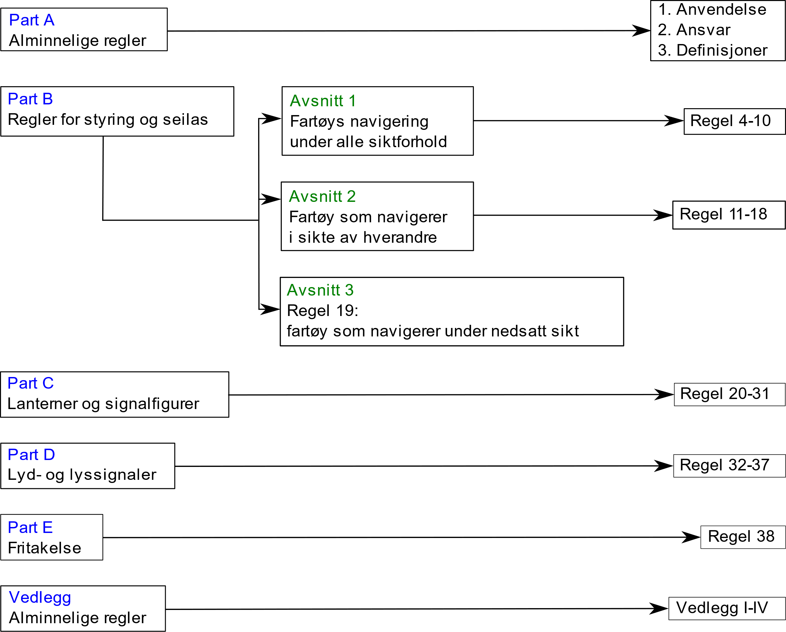 De to første kapitlene har begge fem deler, som vist i figur 2. I de internasjonale reglene er del B, regler for styring og seilas, igjen delt inn i tre avsnitt. Disse tre avsnittene er avsnitt 1, fartøy som navigerer under alle siktforhold, avsnitt 2, fartøy som navigerer i sikte av hverandre, og avsnitt 3, fartøy som navigerer under nedsatt sikt. Disse avsnittene er det spesielt viktig å kjenne til, og de vil bli grundig presentert i denne boka.
